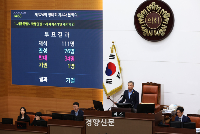 서울시의회는 25일 정례회 본회의를 열어 ‘서울시 학생인권 조례 폐지조례안 재의의 건’을 상정해 무기명 표결에 부쳤다. 재적 의원 111명에 찬성 76표, 반대 34표, 기권 1표가 나와 학생인권조례는 최종적으로 폐지됐다.