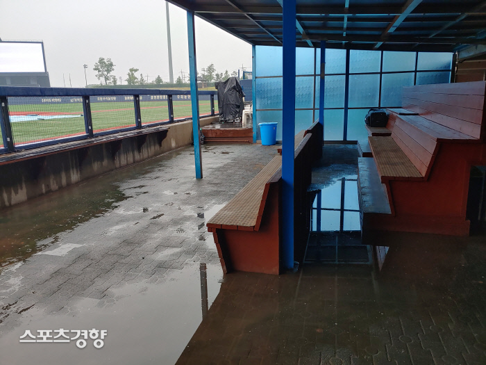 지난 26일 포항야구장에 내린 비는 개장 7주년을 앞두고 있는 구장의 민낯을 밝혔다. 더그아웃을 덮은 지붕과 그 옆을 지나는 배수관에서는 이따금씩 물방울이 뚝뚝 떨어졌다. 더그아웃 바닥에는 물이 고였는데, 더그아웃 천장이 비칠 정도로 물이 많았다.