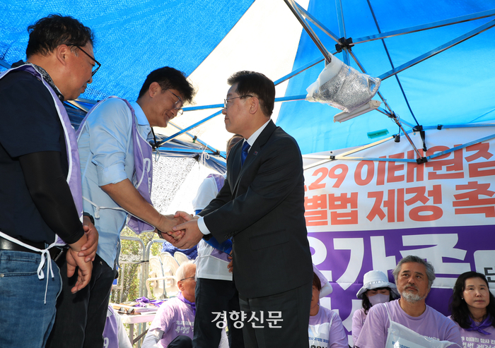 이재명 더불어민주당 대표가 28일 국회 앞에서 특별법 제정을 촉구하며 단식농성중인 이태원참사 유가족을 만나 대화하고 있다. 문재원 기자