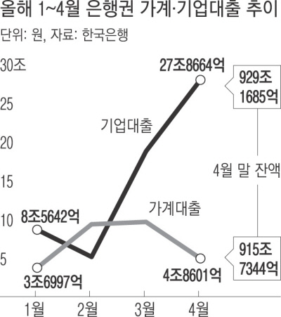 반면 기업은행을 제외한 5대 시중은행의 5월 대기업 대출 증가액은 3853억원으로 3월(8조949억원), 4월(5조8052억원)과 비교해 대폭 감소했다. 지난 3월과 4월엔 코로나19 영향으로 회사채 시장이 경색되면서 대기업들이 자금난을 겪었지만 최근 들어 정부의 채권시장 안정 조치 등으로 회사채 시장이 안정되면서 대기업들의 자금 운용에도 숨통이 트인 상태다.
