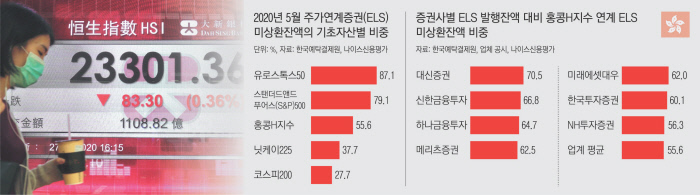 7일 나이스신용평가의 ‘홍콩보안법발 미·중 분쟁 관련 국내 증권사 ELS 리스크 점검’ 보고서를 보면, 지난달 기준 국내 증권사가 발행한 전체 ELS 미상환잔액 중 홍콩 항셍중국기업지수(H지수)가 기초자산으로 포함된 상품의 비중은 55.6%다. 유럽의 유로스톡스50(87.1%), 미국 스탠더드앤드푸어스(S&P)500(79.1%)에 이어 세 번째로 높다. 국내 ELS 투자금 중 홍콩 주가의 변동에 따라 수익 및 손실이 결정되는 액수가 적지 않다는 것이다. 증권사별로도 ELS 발행잔액 중 H지수 관련 상품 잔액 비중이 업계 평균(55.6%)보다 높은 곳이 7곳에 달했다.