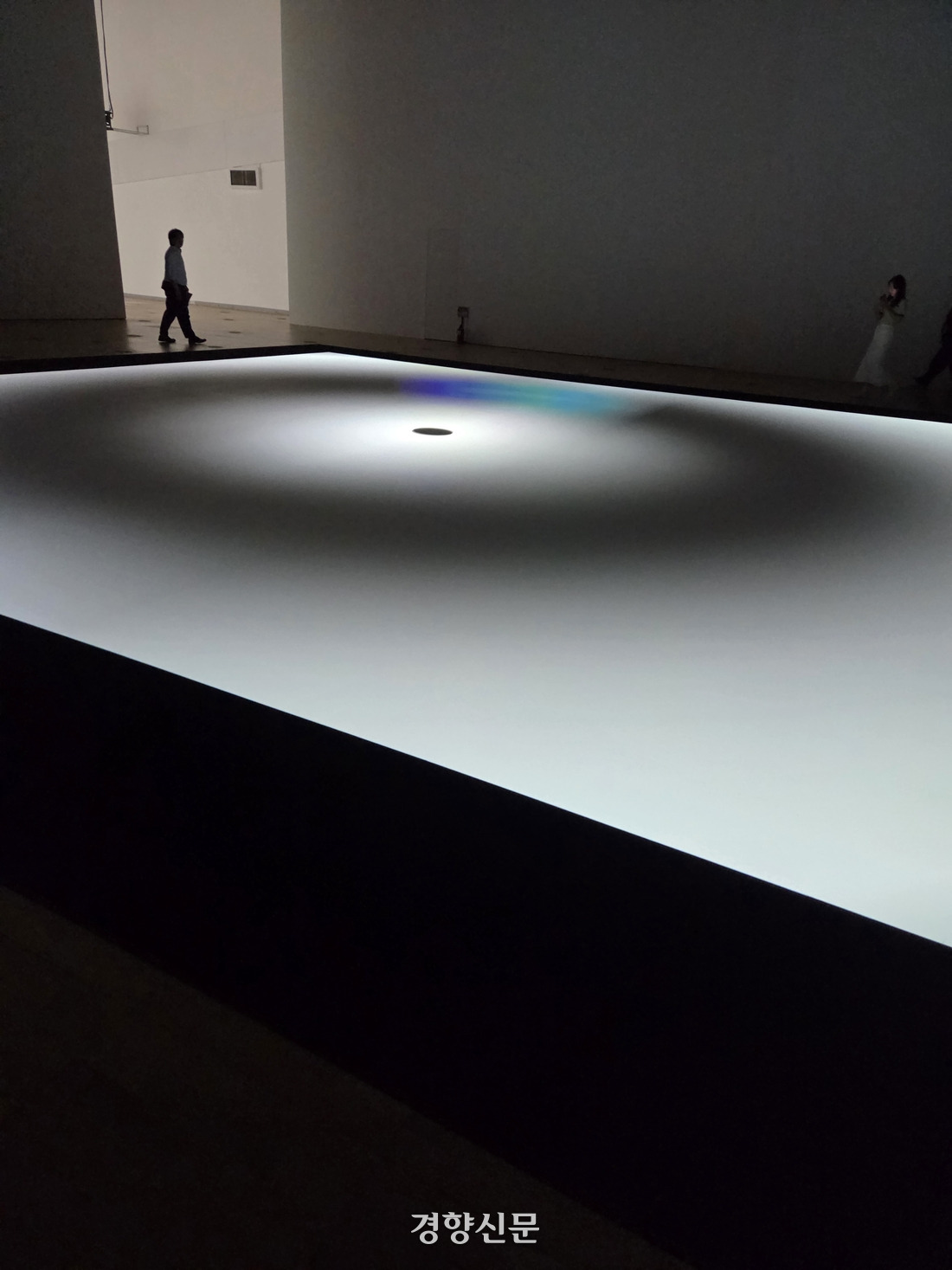 이케다는 이번 전시에 신작 4점을 포함해 작품 7점을 선보인다. 대표작 ‘data-verse’만큼 눈에 띄는 신작은 천장에 10m 길이로 설치된 ‘data.flux [n˚2]’와 바닥에 가로·세로 각 10m 크기 영상을 투사하는 ‘critical mass’다. ‘data.flux [n˚2]’는 인간의 유전자 정보를 숫자나 영어 등으로 바꿔 기하학적 패턴으로 시각화한 영상이다. 눈에 잡히지 않을 정도로 빠르게 움직이는 데이터들은 계곡물처럼 빠르게 흐른다. ‘critical mass’는 큰 터널에서 들을 법한 진동음과 함께 어둠이 동심원을 그리며 커지고, 화면을 메운 뒤 다시 빛을 비추는 형식이 반복된다.
