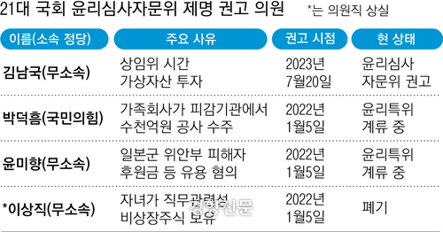 윤리심사자문위가 제명을 권고한 사례는 21대 국회 들어 윤미향 무소속 의원, 이상직 전 무소속 의원, 박덕흠 국민의힘 의원에 이어 이번이 네 번째다. 윤 의원은 정의기억연대 기부금 유용 의혹, 박 의원은 가족 회사가 피감기관에서 계약을 수주하도록 개입한 의혹을 받았다. 이스타항공 배임·횡령 혐의로 기소된 이 의원은 재판으로 의원직을 상실해 징계안이 폐기됐다. 윤·박 의원 제명안은 윤리특위에 1년6개월째 계류 중이다.