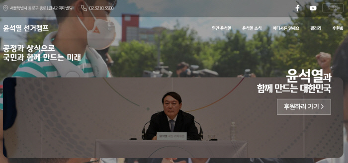 홈페이지를 보면, 윤 전 총장의 어렸을 때 사진 등을 담은 ‘인간 윤석열’, 윤 전 총장의 사회관계망서비스(SNS) 메시지와 영상 등을 모아놓은 ‘윤석열 소식’, 지지자들의 응원 메시지 등을 소개해 놓은 ‘어디서든 말해요’ 등의 메뉴가 배치돼 있다. 오는 26일부터 시작된 후원금 모집도 홈페이지에 안내돼 있다. 윤 전 총장 후원회장을 맡은 황준국 전 영국대사의 인사말도 실려있다.