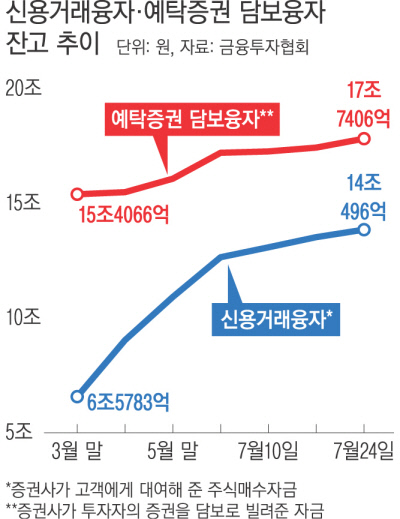 27일 금융투자협회 통계를 보면, 지난 24일 기준 신용거래융자금 잔고는 14조496억원, 예탁증권담보융자금 잔고는 17조7406억원이었다.