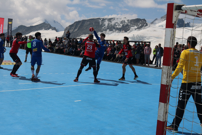 한국 남자 핸드볼 대표팀이 알프스 고지대 빙하 위에 마련된 임시 경기장에서 이벤트 경기를 치렀다.