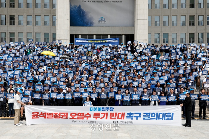 민주당은 전날부터 국회 로텐더홀에서 소속 의원들이 1박2일 간의 철야 농성을 이어왔다. 민주당 의원들은 이날 국회 본청 앞 계단에서 당원과 지지자들이 모인 가운데 오염수 투기 반대 촉구 규탄대회를 열었다. 민주당은 규탄대회에 약 1500명이 모였다고 밝혔다.