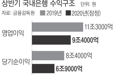 올해 상반기 국내은행들의 당기순이익이 지난해 같은 기간에 비해 1조5000억원 정도 줄어든 것으로 나타났다. 코로나19에 대비해 은행들이 충당금을 2조원 늘린 결과다.