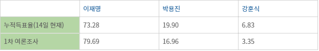 최종 경선 결과에 12.5% 반영되는 1차 국민여론조사에서는 이 후보 79.69%, 박 후보 16.96%, 강 후보 3.35%를 기록했다. 같은 조사에서 최고위원 후보로는 정청래(30.61%), 고민정(21.57%), 장경태(12.61%), 서영교(11.78%), 박찬대(9.5%), 윤영찬(6.25%), 송갑석(5.41%), 고영인(2.27%) 후보 순으로 득표했다. 1차 국민여론조사 결과는 오는 26~27일 치르는 2차 국민여론조사, 일반당원 여론조사와 함께 28일 발표되는 최종 결과에 합산된다.
