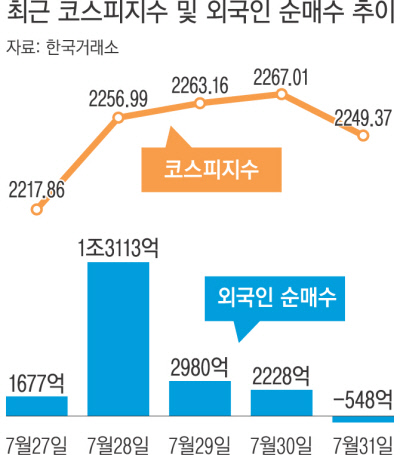 다만 외국인의 ‘사자’ 행렬과 지수 상승이 계속될지는 단언하기 어렵다. 지난달 31일 코스피는 고점을 찍은 뒤 마감 때까지 하락했고 결국 종가는 전날보다 0.78% 하락한 2249.37이었다. 이날 외국인 투자자들이 코스피 시장에서 548억원 순매도한 것과 무관하지 않다.