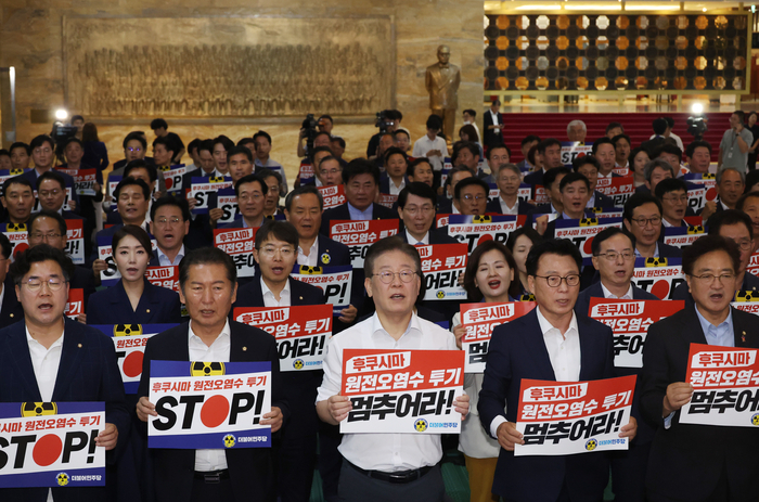 민주당은 이날 오후 7시부터 국회 본청 로텐더홀에서 긴급 의총에 돌입했다. 민주당은 지난 29일 의원 워크숍에서 원전 오염수 해양 투기 중단 촉구 2차 비상행동을 하기로 결의하고 지난 30일 지도부가 전남 목포를 방문해 결의대회를 연 데 이어 이날 철야 의총을 했다.