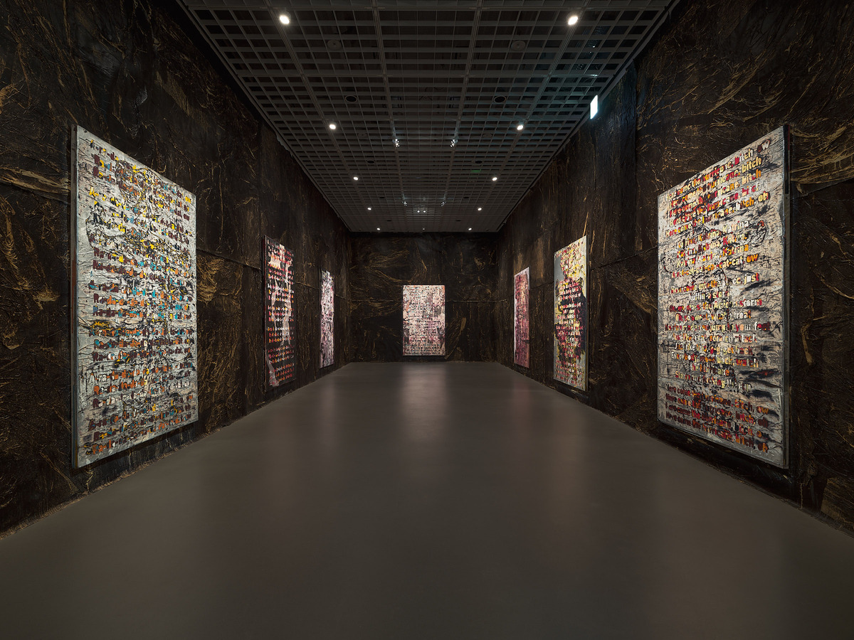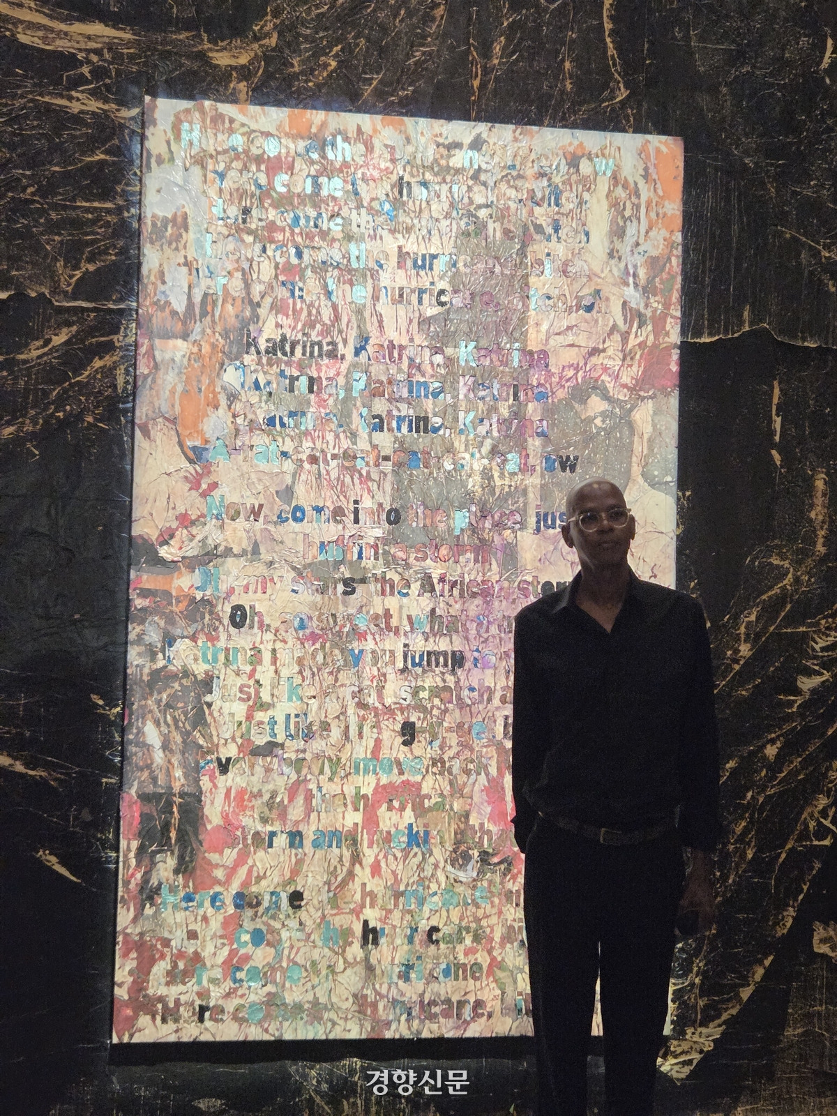 그가 스완의 몸짓을 바탕으로 신작 ‘폭풍이 몰려온다’(2025)를 만든 것은 젊은 날에 겪었던 경험과 무관치 않아 보인다. 폭풍은 2005년 미국 남부 루이지애나주 뉴올리언스를 강타한 허리케인 카트리나를 뜻한다. 재즈의 발상지로 유명한 뉴올리언스는 그의 아버지의 출신지였으며, 대형 폭풍이 닥쳤을 때 가장 큰 피해를 보며 소외된 흑인이 많은 곳이었다. 검은 벽지로 둘러싼 전시장 안에는 스완의 몸짓을 그린 그림 위에 래퍼 케빈 제이지 프로디지의 노래 ‘HERE COMES THE hURRICANE LEGENDARY KATRINA’ 가사가 스텐실로 새겨진 대형 화폭 7점이 놓였다. 프로디지 역시 볼룸에서 음악 활동을 시작했다. 자연재해 앞에서 피해를 본 흑인들과, 재해와도 같은 사회적인 억압에서 벗어나고자 했던 스완이 화폭에 겹쳐졌다.