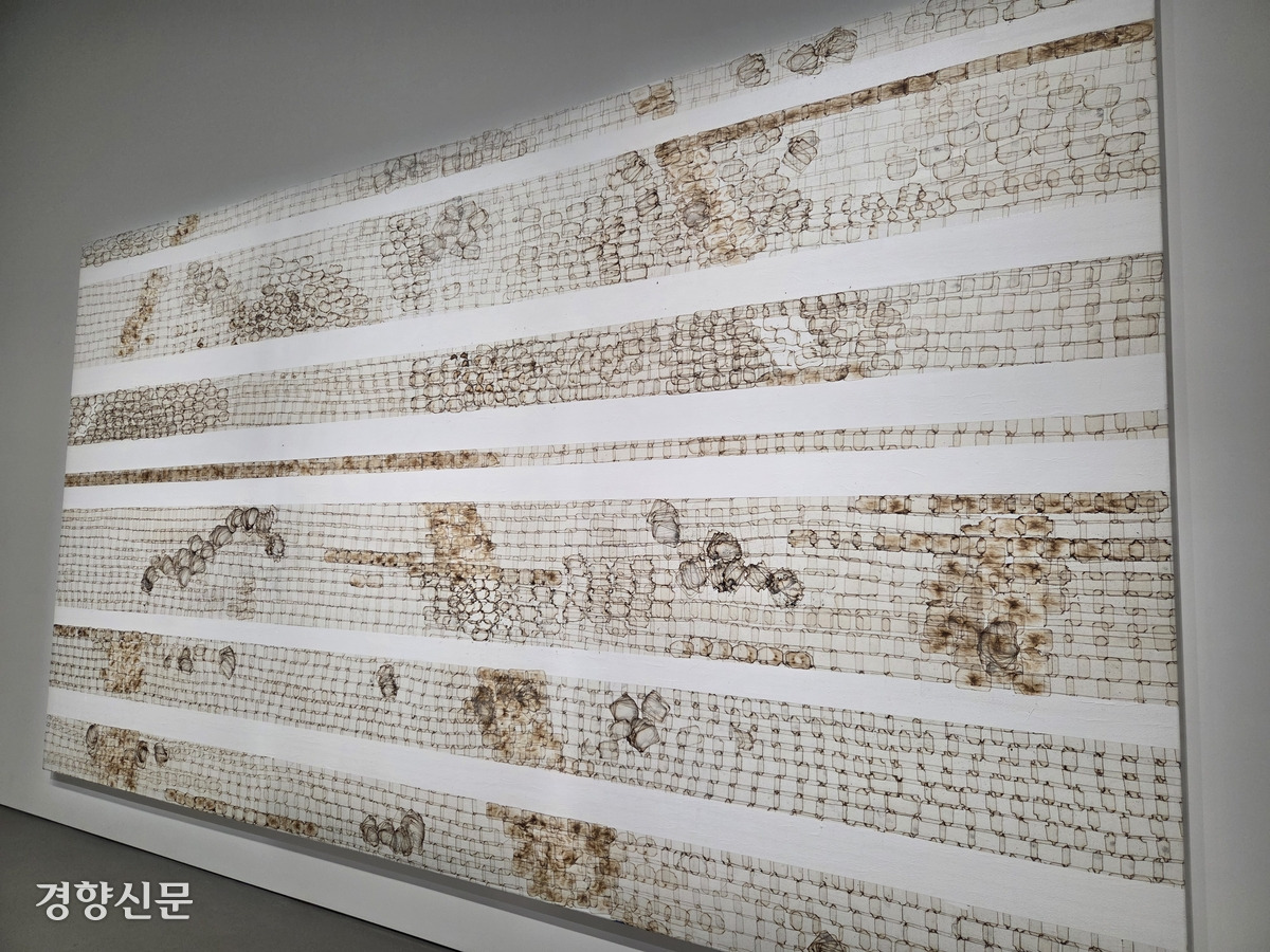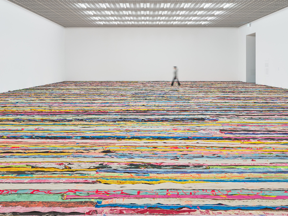 브래드포드와 그가 살았던 시대의 배경을 알아야 하는 작품 외에도 여러 대형 작품들이 존재감을 내고 있다. 전시 공간 바닥 약 600㎡를 다양한 색의 캔버스와 종이, 끈으로 채운 ‘떠오르다’(2019)는 벽이 아닌 바닥에 회화를 옮기고, 관람객이 직접 밟으며 지나갈 수 있도록 한 독특한 구상이 눈에 띈다. 관람객이 발로 밟고 흩트리며 생기는 변화도 작품의 일부가 된다. ‘공기가 다 닳아있었다’(2025)를 포함한 기차 시간표 연작 3점은 각자 폭 5m, 높이 3m가 넘는 대형 작품으로 미국 각지와 소요 시간이 적힌 기차 시간표를 통해 20세기 차별을 피해 이주했던 흑인들의 삶을 표현한다.