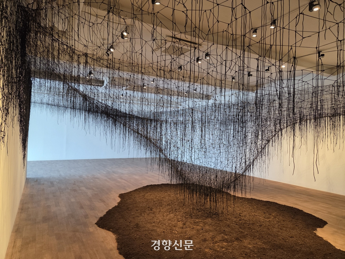 전시 첫날 기자들과 만난 시오타는 “실의 검은 색은 우주를, 바닥을 향해 늘어진 실의 형태는 중력을 뜻하는 것”이라고 설명했다. 중력으로 대표되는 자연의 법칙을 생각하다 보면 죽음 이후 흙으로 돌아가는 생명의 흐름이 잔상으로 남게 된다.