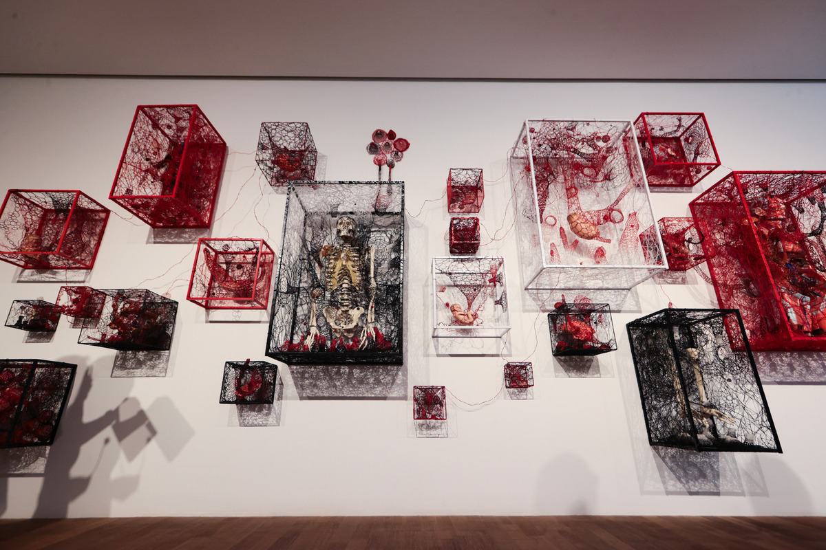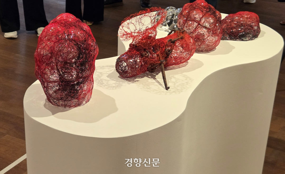 전시장의 분위기는 어둡고 무거운 편이다. ‘Cell’ 연작과 ‘The Self in Others’ 연작에는 인체와 붉고 검은 선이 등장한다. ‘Cell’ 연작은 유리로 인체에 있을 법한 세포를 만든 뒤 혈관처럼 붉고 검은 철사로 감았다. ‘The Self in Others’ 연작은 뇌와 각종 소화기관, 신체를 이루는 근육에 태아를 품은 자궁에 이르는 인체 기관 모형을 금속 틀에 넣어놓고는 실로 얽거나 서로 연결했다.