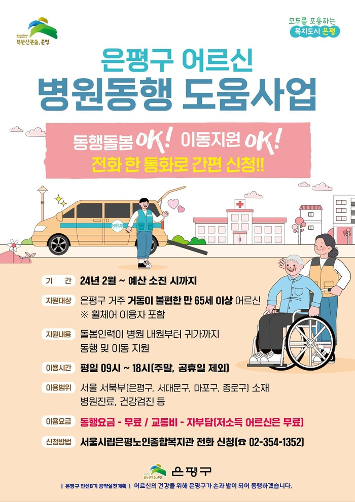 은평구는 6일 “어르신 병원동행 도움사업 이용자의 서비스 만족도가 높고 저소득층이 아닌 어르신도 병원 동행 문의가 많은 점을 반영해 서비스를 확대하기로 했다”고 밝혔다.
