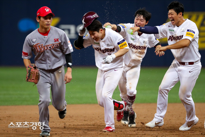 김혜성은 9일 고척스카이돔에서 열린 2019 신한은행 마이카 KBO리그 SK전에 4-4로 맞선 9회말 1사 2루에서 끝내기 우중간 2루타를 쳐 팀의 5-4 승리를 이끌었다. SK의 마무리로 올 시즌 세이브 1위(27개)를 달리던 하재훈을 상대로 한 것이라 기쁠 법도 했다.