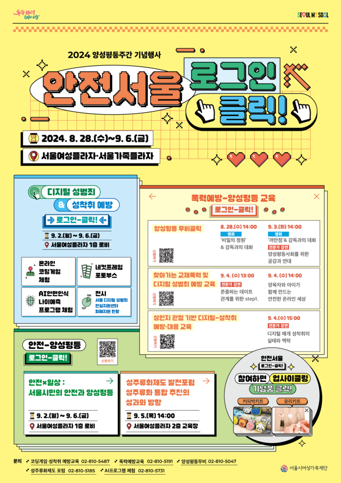 서울시여성가족재단은 양성평등주간을 맞은 2일부터 6일까지 기념행사 ‘안전서울 로그인-클릭’을 개최한다고 1일 밝혔다.