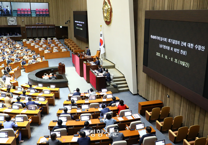 다수 의석을 차지한 야당은 당론으로 채택한 오염수 대응 특별 안전조치 4법과 노란봉투법(노동조합법 개정안), 방송 3법을 이번 정기국회에 처리하려 할 것으로 보인다. 여당은 이에 반대하며 우주항공청 설치를 위한 특별법 처리에 나설 것으로 보인다.