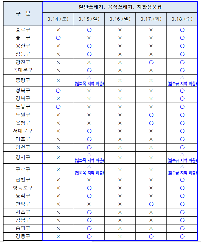 오는 16일에는 서울 전 자치구에서 생활쓰레기 배출이 금지된다. 18일에는 모든 자치구에서 가능하다. 다만 중랑구, 강서구, 구로구는 평소 일·화·목요일에 생활쓰레기를 배출하는 지역은 15일, 월·수·금요일 배출 지역은 18일에 배출하게 했다. 14, 15, 17일은 지역별로 차이가 생기기 때문에 쓰레기 배출 전 확인이 필요하다.