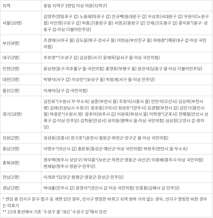 이들 중 21대 국회에서 동일 지역구, 혹은 유사 지역구에서 3연임을 한 의원은 총 55명이다. 기존 지역구가 합구·분구 등으로 미세하게 바뀐 경우도 포함했다. 지역구 의원 중 21.7%이며, 국회의원 정원 기준 18.3%다. 지역구 의석수가 가장 많은 경기도(18명)와 서울(10명)에 지역구 3연임 의원 중 절반 이상이 분포돼 있었다. 반면 민주당의 텃밭인 광주와 전북, 국민의힘 강세지역인 경북에서는 1명도 없었다. 거대 양당이 총선 공천 때마다 진행하는 ‘물갈이’가 당의 텃밭에서 진행되는 관례와 맞물린 것으로 보인다. 호남의 경우 다선 의원들이 20대 총선 때 국민의당 소속으로 당선됐다가 21대 총선에서 대거 낙선된 상황이 반영됐다.