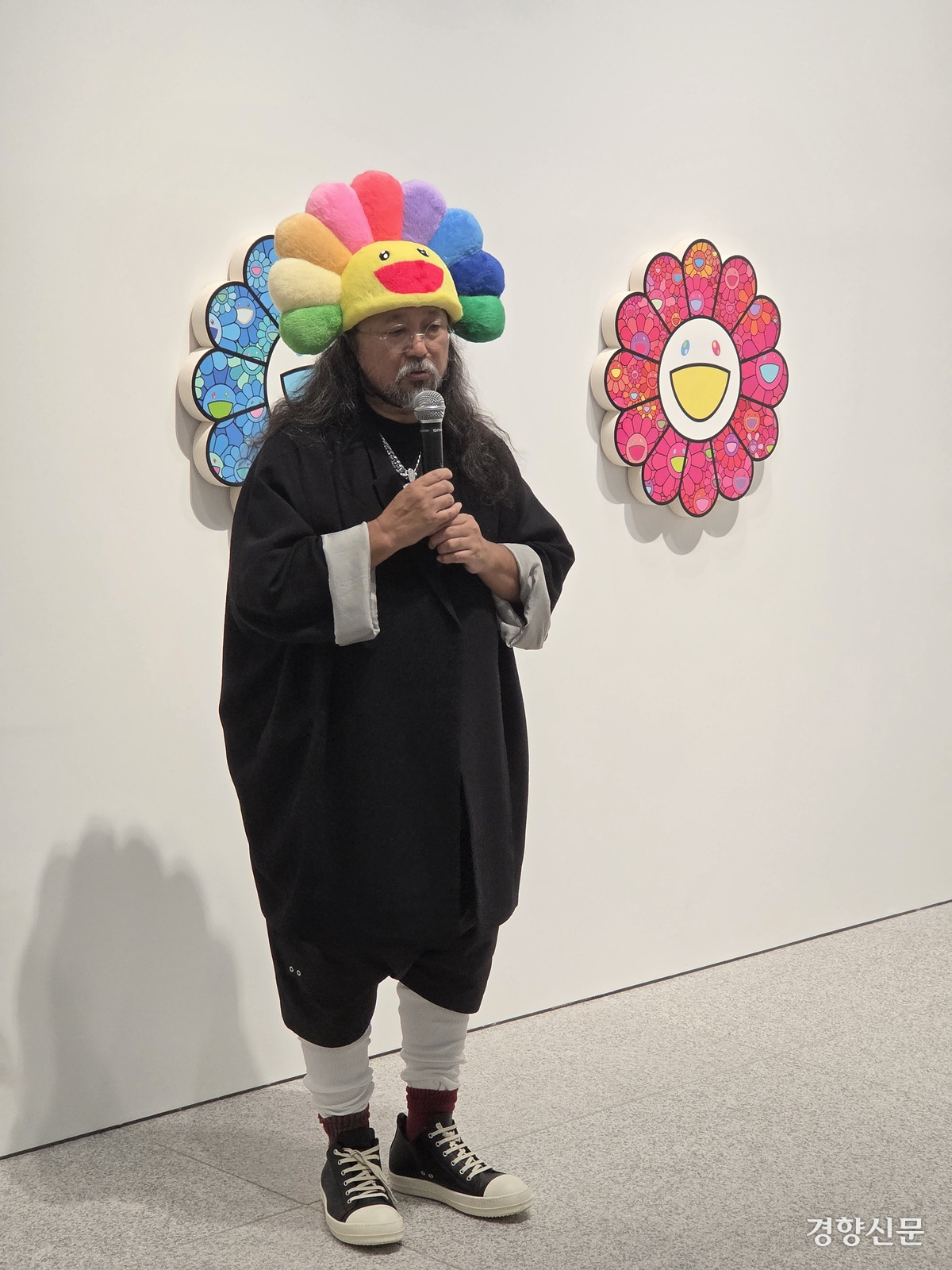 지난 1일 꽃 모자를 쓰고 기자들과 만난 무라카미는 “SNS의 발달로 사람들이 고양이 등 귀엽고 아름다운 것들을 공유하게 됐다”며 “예술가들도 귀여움이라는 것을 추구하게 된 것 같다”고 말했다. 그는 “AI(인공지능)가 탄생하고, 모든 사람이 지식을 평탄하게 가질 수 있는 사회가 나타났다”며 “이런 것들을 미리 예언해서 맞힌 것이 아닌가 만족한다”고도 말했다. 전시는 다음달 11일까지.