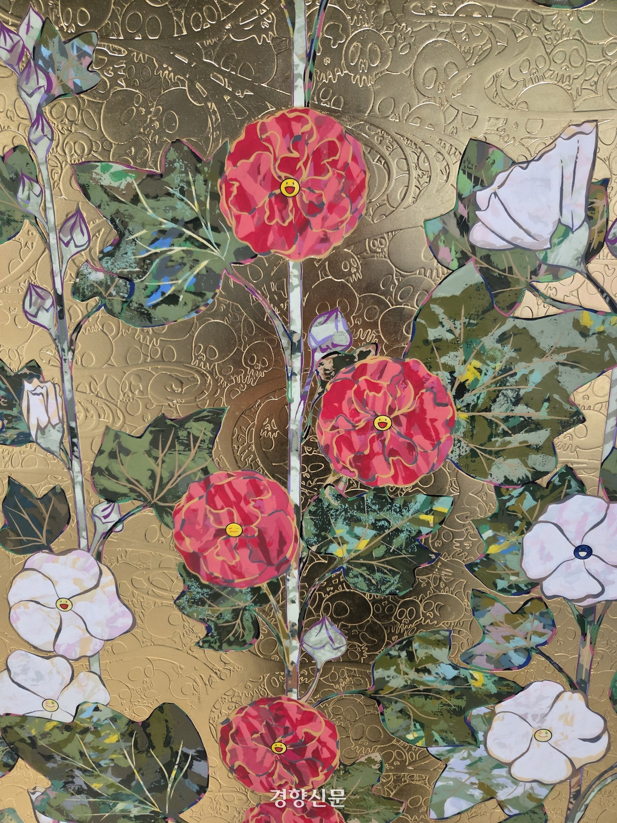 16~17세기의 화가 오가타 코린의 ‘국화도’ 병풍을 재해석한 ‘Tachiaoi-zu’(2025)는 금박에 일본화풍 꽃을 그리고는 꽃 가운데에 특유의 웃는 표정을 그려 넣었는데, 금박을 자세히 살펴보면 해골 문양이 양각돼 있다. 양립하기 어려운 것들을 공존시켜 온 무라카미의 작품 세계를 곱씹게 된다.