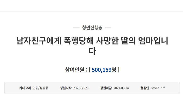 이날 온라인 커뮤니티 등에 따르면 한 트위터 사용자는 지난 16일 자신의 계정에 “오늘 퇴근길에 4호선 탔는데 기관사 분이 안내방송으로 자기 가족이 얼마전에 데이트 폭력으로 사망했는데 국민청원 올렸으니 관심 부탁드린다(고 했다)”며 “‘이런 안내 방송이 불편하시겠지만 이렇게밖에 알릴 방법이 없다고 양해 해달라’고 (했다)… 말하는데 진짜 너무 슬퍼서 오열할뻔”이라는 글을 썼다.