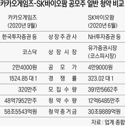 카카오게임즈 기업공개(IPO) 상장 주관사인 한국투자증권과 삼성증권, 공모주 인수사 KB증권은 지난 1일부터 이틀간 진행된 카카오게임즈 공모주 일반 청약 절차에 증거금으로 총 58조5543억원이 모였다고 2일 밝혔다. 이는 지난 6월 SK바이오팜이 세운 공모주 일반 청약 증거금 기록(30조9889억원)의 두 배 수준이다.