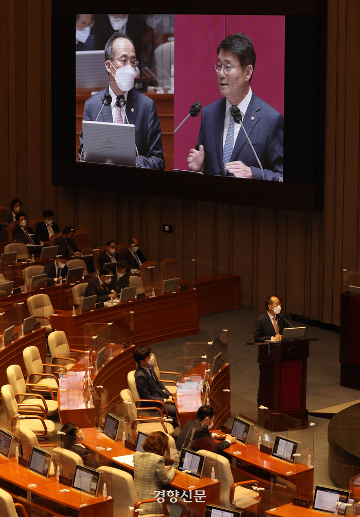 김 의원은 “윤석열 정부의 경제정책 논리는 부자 감세, 규제 완화를 통해 대기업 투자를 유치해 성장의 선순환을 만들겠다는 너무 쉬운 논리”라며 “국가 경제가 어려울 때 (법인세를) 내린 국가는 하나도 없다”고 주장했다. 추 부총리는 “지난 정부를 제외하고는 김대중 정부 때부터 법인세를 일관되게 내려왔다”고 말했다.