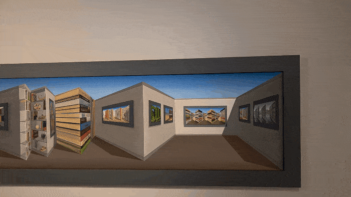 가까이 다가가면 그림의 비밀을 알 수 있다. 그림은 평면의 캔버스가 아니라 뾰족하게 솟거나 움푹 들어간 나무판 위다. 그림 속 복도 끝은 평면이나 움푹한 부분에 있는 것으로 보이지만, 그림 옆으로 다가가면 사실 돌출된 부분에 그려져 있다는 것을 비로소 알 수 있다. 반대로 정면에서 보면 앞으로 튀어나온 듯한 건물은, 그림 속 가장 움푹 들어간 부분에 그려져 있다. 멀리 보이는 부분이 사실은 가장 가까이에, 가까이 보이는 부분이 가장 멀리 배치되면서 그림이 움직이는 듯한 착시가 발생한다.