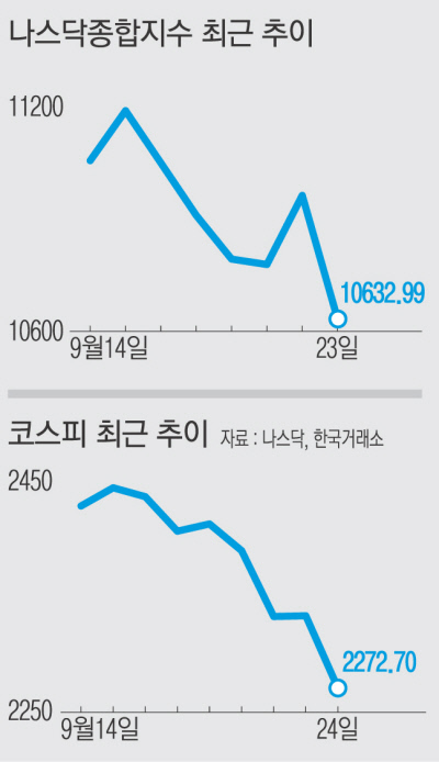 지난 22일(현지시간) 열린 ‘테슬라 배터리데이’ 여파도 컸다. 눈에 띄는 신기술이 발표되지 않자 업계는 ‘기대 이하’라는 평가를 내렸고, 그간 기대치 덕에 부풀었던 관련주 주가는 하락세로 돌아섰다. 23일 테슬라 주가는 전 거래일보다 10.34% 폭락했다. 대형 기술주에 대한 투자심리도 위축됐다. 김학균 신영증권 리서치센터장은 “이미 기술주 주가는 기대치에 비해 과도하게 오른 측면이 있어 조정에 들어간 것으로 보인다”고 말했다. 열흘 전까지만 해도 11000선을 유지하던 나스닥종합지수는 23일 전 거래일보다 330.65포인트(3.02%) 하락 마감했다.