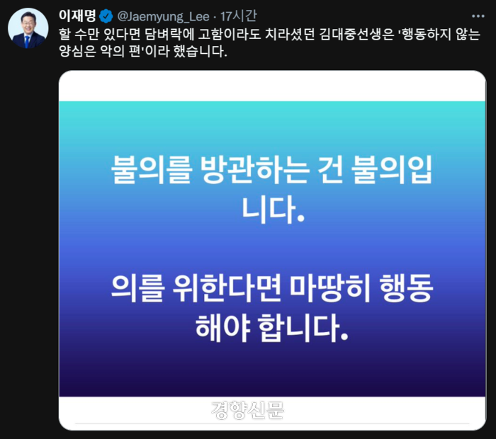 [9월25일]이재명 “불의를 방관하는 건 불의···행동하지 않는 양심은 악의 편” (0) | 2022.10.01 |