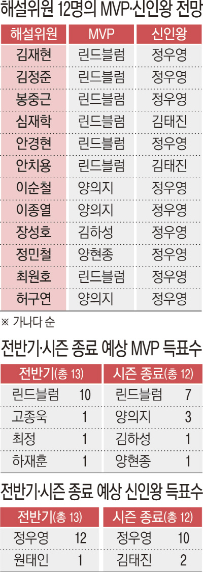 ‘스포츠경향’은 전반기에 이어 후반기 종료에 맞춰 해설위원 12명에게 예상 MVP 및 신인왕과 선정 이유를 들었다. 선두싸움은 치열하고 예측불허지만, 올 시즌 최고의 활약을 보인 선수들의 이름은 그에 비해 어렵지 않게 압축됐다. 후반기 막판 잠시 주춤해도, 그 임팩트를 능가할 대적이 없던 탓이다.