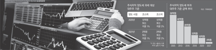 올해 말 기준으로 양도소득세를 내는 ‘대주주’의 주식 보유액 기준이 종전 10억원에서 3억원으로 낮아진다. 올해 말 기준으로 한 종목을 3억원 이상(직계존비속 및 배우자 합산) 보유하고 있으면 내년 4월부터 매도차익에 대해 최소 20%의 양도세를 물게 된다. 이 같은 변화를 두고 주식시장의 변동성이 커질 것이라는 우려와 ‘소득 있는 곳에 과세해야 한다’는 주장이 맞서고 있다. 2017년 정부는 자산소득에 대한 과세를 강화하기 위해 대주주 요건을 종목당 25억원, 2018년 15억원, 지난해 말에는 10억원 등 지속적으로 낮춰왔다.
