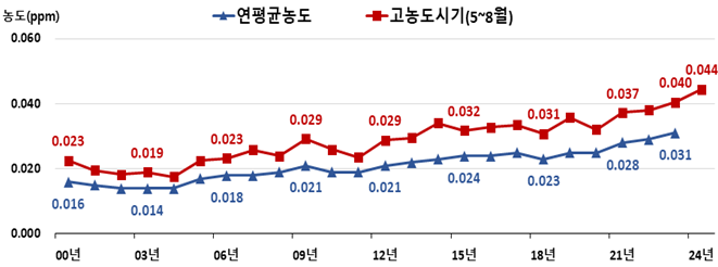 5~8월 오존주의보 평균 발령 지속시간은 3.2시간으로 2019년 2.6시간, 2021년 2.2시간에 비해 늘었다. 가장 일찍 발령되는 시간이 지난해의 오후 1시보다 당겨진 낮 12시였고, 가장 늦게 해제된 시간은 오후 11시였다.