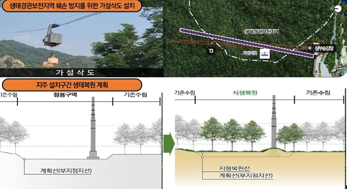 서울시는 중간 지주 설치 때 자재 운반은 삭도를 가설해 공중으로 하기로 했다. 지상으로 자재를 나르다 숲이 훼손되는 상황을 줄이겠다는 의도다. 또 중간 지주 설치로 훼손된 숲은 복원해 훼손되는 면적을 20㎡로 줄이겠다고도 했다.