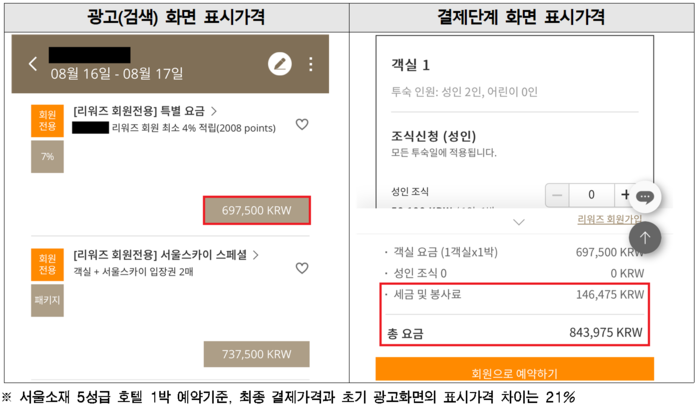 서울시 내 5성급 호텔 27곳 중 90%는 초기 광고화면에는 세금·기타비용을 제외한 가격을 표기했다가 결제 단계에서 세금 등을 포함해 10~21% 높은 금액을 표시하는 것으로 나타났다.
