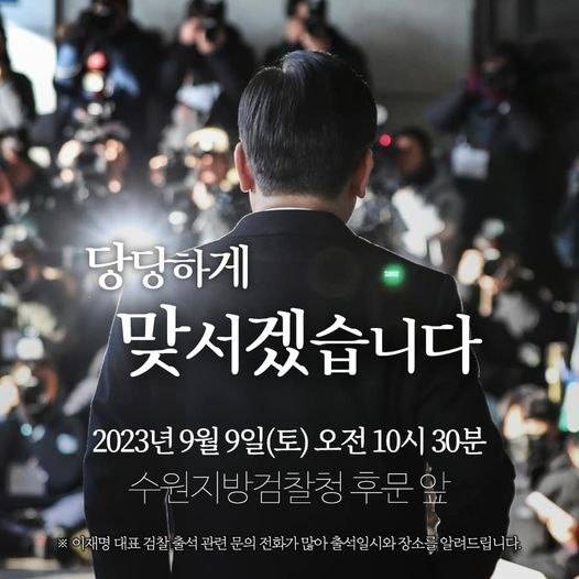 민주당 대표 비서실은 이날 사회관계망서비스(SNS)를 통해 “이 대표는 오는 9일 오전 10시30분 수원지검 후문을 통해 출석한다”고 밝혔다. 출석 예고 포스터에는 이 대표 출석 관련 문의 전화가 많아 출석 일시와 장소를 알려준다는 내용이 담겼다. 지지자들에게 이 대표 출석에 맞춰 현장에 나오라는 메시지를 준 것으로 풀이된다.